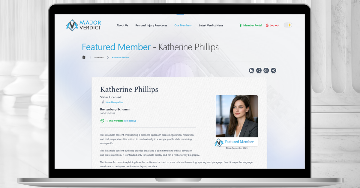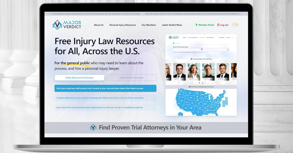 In addition to attorney profiles, Major Verdict operates a national plaintiff verdict news blog covering significant personal injury verdicts and settlements across the United States. The blog publishes multiple times per week and serves as both a public legal news resource and an additional visibility channel for Featured Member attorneys who submit new verdicts. The platform also maintains free, comprehensive personal injury public resource pages for all 50 states. Major Verdict is live and accepting trial attorney memberships now at: https://majorverdict.com/join-major-verdict.